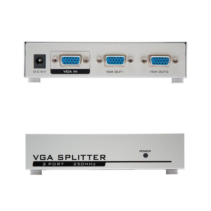 Nanocable VGA DUPLICADOR PARA 2 MONITORES CON ALIM.. Tipo de puerto de vídeo: VGA. Máxima resolución: 1920 x 1440 Pixeles, Color del producto: Plata, Material de la carcasa: Metal. Longitud del paquete: 6 cm, Ancho del paquete: 100 mm, Altura del paquete: 230 mm. Contenido del paquete: RoHS - Duplicador SVGA para 2 monitores con fuente de alimentación.\n- El duplicador SVGA de 2 Puertos permite que una sola fuente VGA pueda proporcionar imágenes en dos monitores simultáneamente. Perfecto para aulas, ferias, exposiciones, o exhibidores dentro de comercios donde se requiere alta calidad de vídeo en varios monitores. La simple operación plug and play facilita la configuración, por lo que este dispositivo se puede instalar y comenzar a utilizar en poco minutos.\n- El duplicador soporta hasta 250 MHz de ancho de banda, proporcionando imágenes con resoluciones de hasta 1920x1440. Dispone de un circuito de amplificación de señal incorporado que permite visualizar imágenes a 65 metros de la fuente.\n- Permite la conexión en cadena margarita\n- Puerto de entrada de señal: macho\n- Puerto de salida de señal: hembra\n- Carcasa metálica resistente\n- Cables SVGA no incluidos