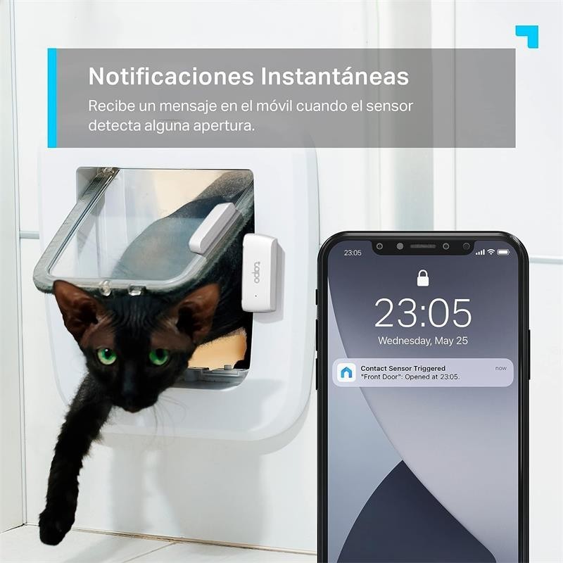 - Notificaciones instantáneas. Recibe en el móvil un mensaje cuando el sensor se active para saber que ocurre en casa.