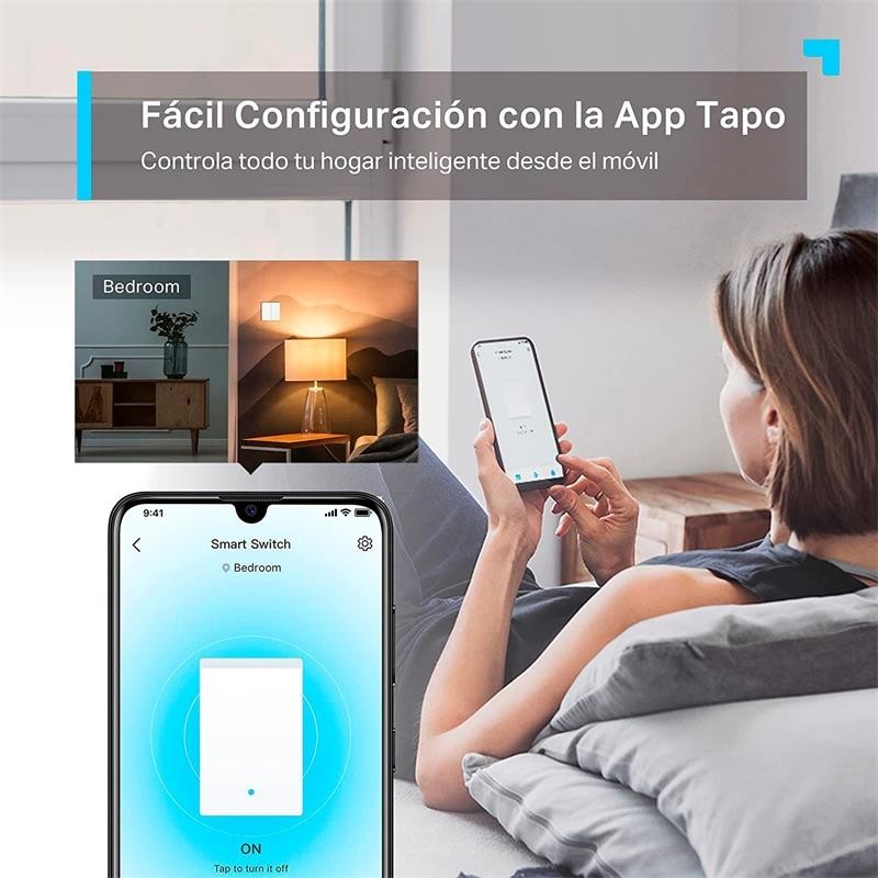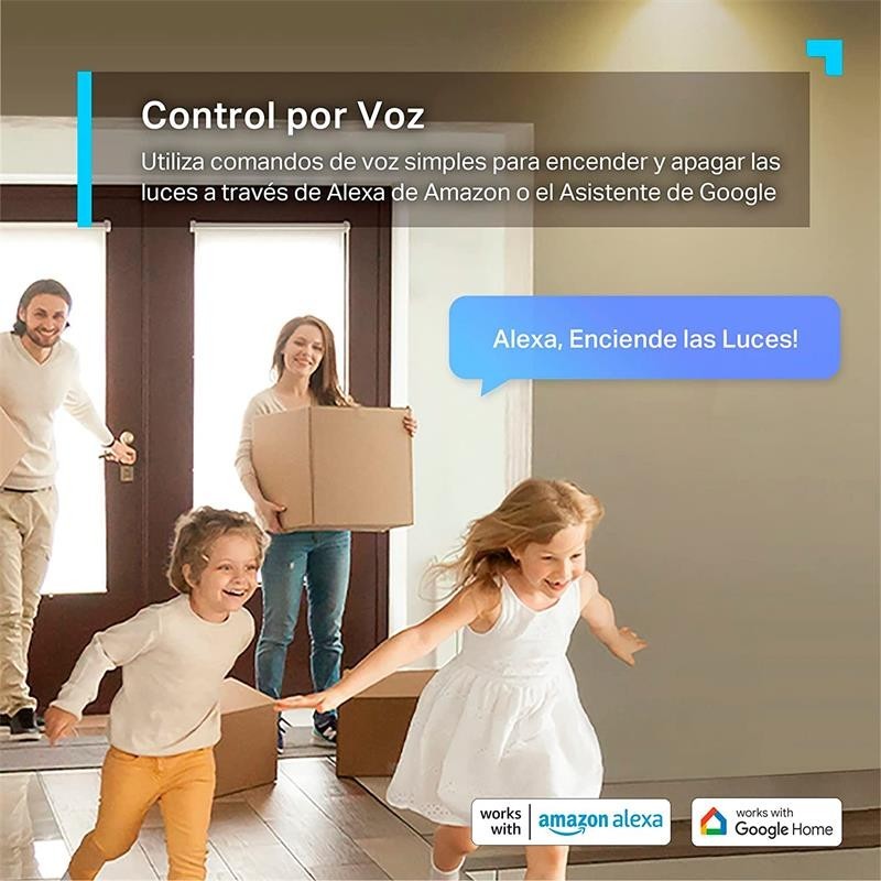 - Control por voz. Controla el interruptor directamente con comandos de voz a través de Amazon Alexa o el Asistente de Google.
