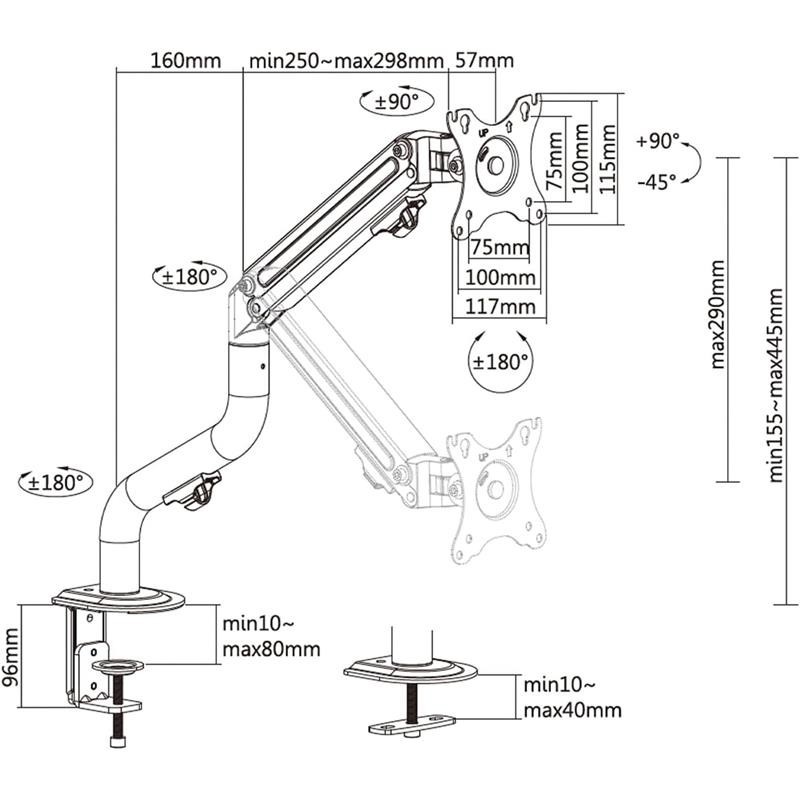 Soporte de mesa Eco Aisens contrapeso giratorio e inclinable para monitor/TV de 3 pivotes y 1 brazo fabricado con acero de alta resistencia y pintado con pintura electrostática para un acabado perfecto. Se permite la instalación en la mesa a través de abrazadera o de tornillo pasante.