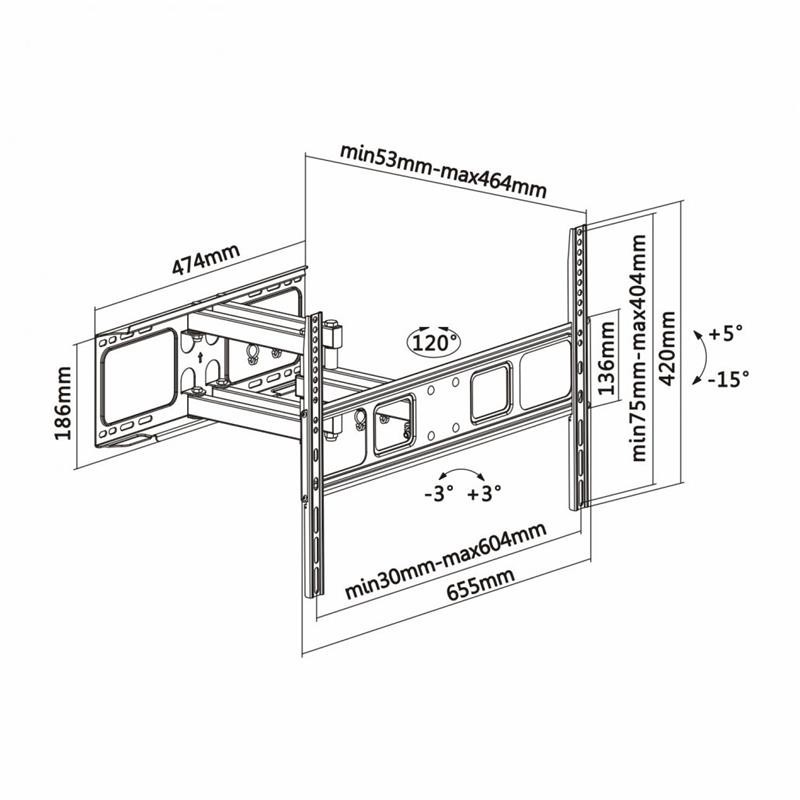 - Distancia de la pared: ajustable entre 53 y 464 mm. Sistema de gestión de cables: dispone de unos ganchos para poder agrupar los cables. Manual de instrucciones multi idiomas.