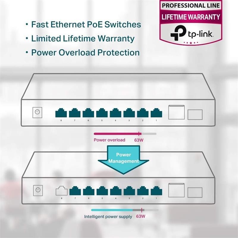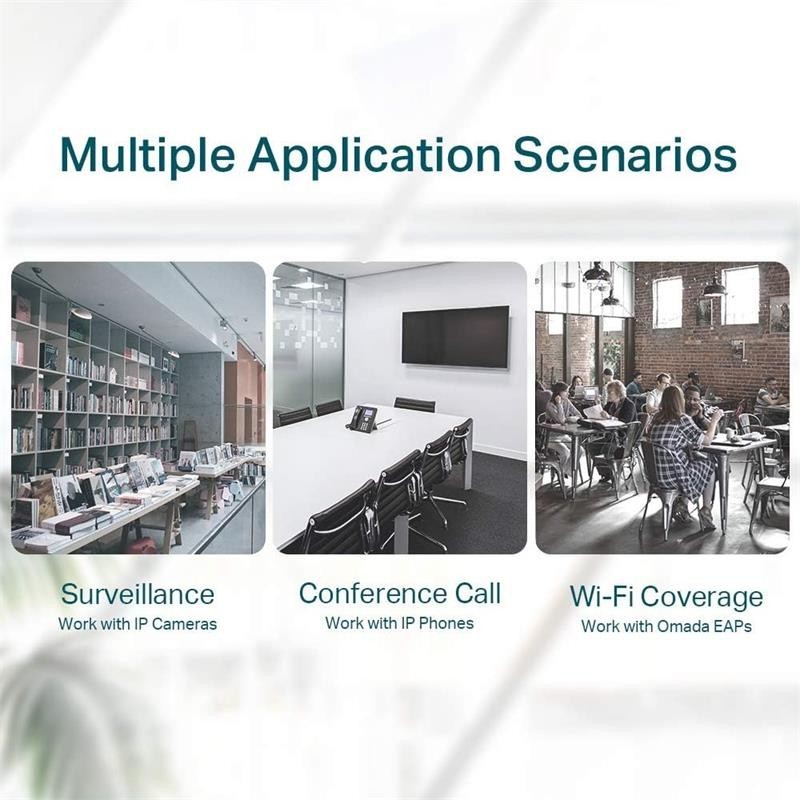 - Con 8 puertos PoE+, transfiere datos y energía en un solo cable