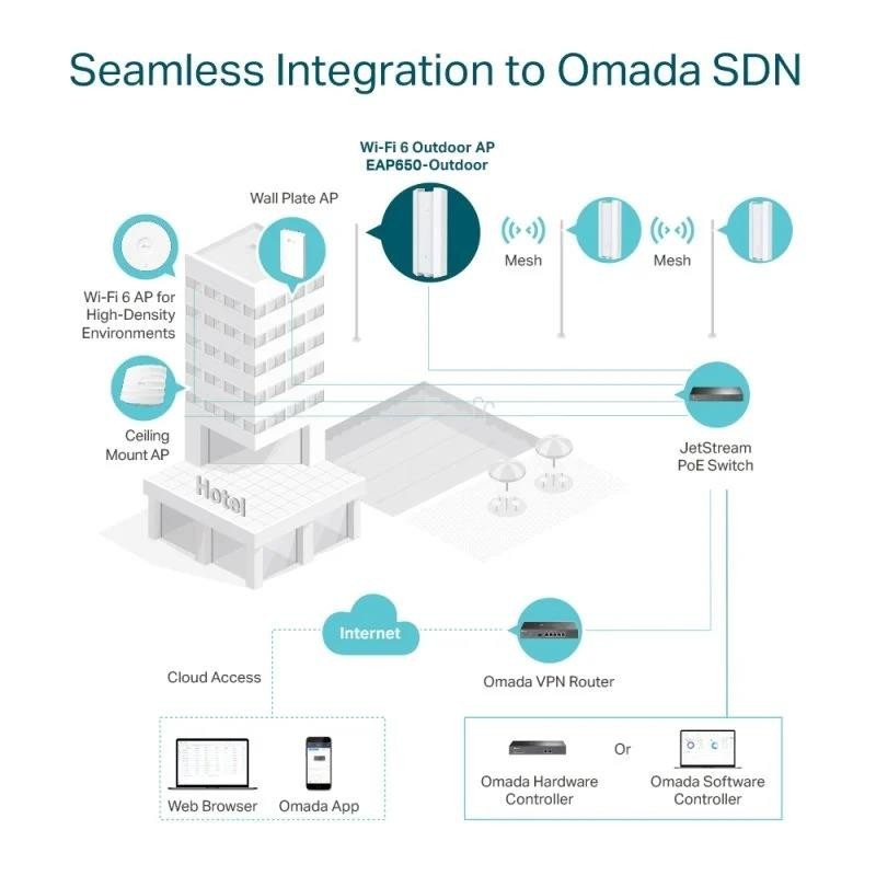 - Gestión centralizada de la nube: la integración de Omada SDN gestiona toda la red localmente o desde la nube a través de la interfaz de usuario web o la aplicación Omada.