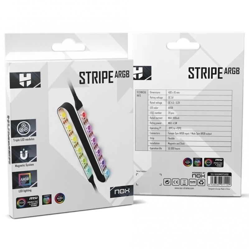 - ALTA COMPATIBILIDAD. Nox Stripe ARGB es compatible con MSI Mystic Lith Sync, Asus Aura Sync y Gigabyte RGB, de forma que, de manera simple, puedas sincronizar tu equipo, iluminando tu configuración al completo, ofreciendo un espectáculo de luces casi infinito, pues Nox Stripe ARGB brinda hasta cincuenta mil horas de vida útil.