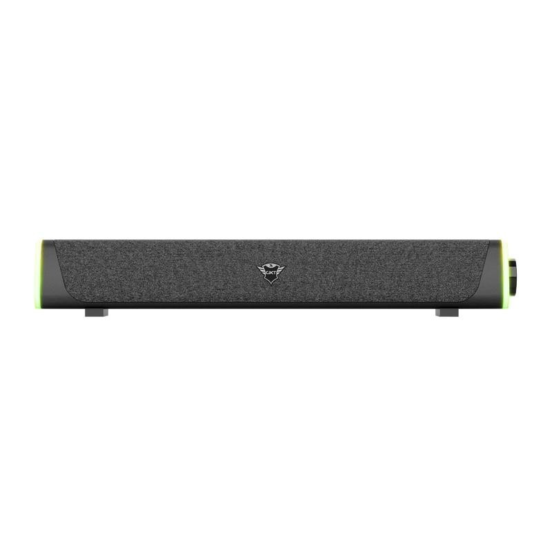 Barra de sonido para gaming Trust GXT 620 Axon con iluminación RGB en ondas de arco iris y volumen de fácil acceso. El diseño compacto de la barra de sonido permite que se pueda colocar fácilmente debajo de una TV o de un monitor de PC, mientras que los 12W de potencia ofrecen cualquier cosa menos un sonido mínimo.