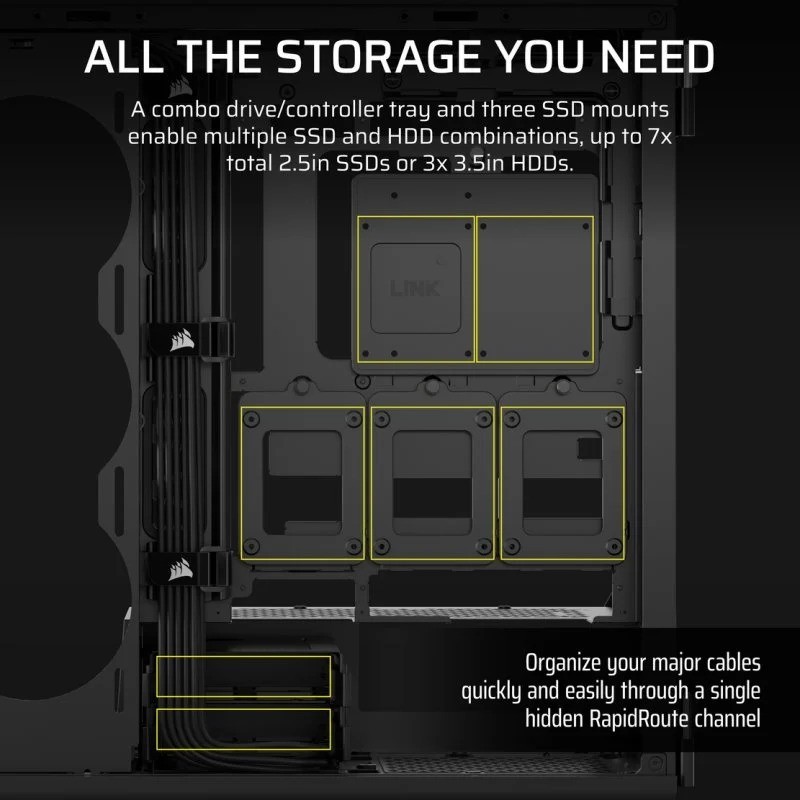 - Todo el almacenamiento que necesitas - Dos bandejas combinadas para unidades y tres montajes para SSD permiten múltiples combinaciones de SSD y HDD, hasta 7 SSD de 2.5" o 3 HDD de 3.5".