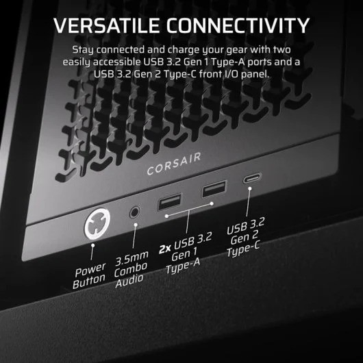 - MODERNO PANEL FRONTAL DE E/S. Deja las conexiones a su alcance, con un puerto USB 3.2 Gen 2 de tipo C, dos puertos USB 3.2 Gen 1 de tipo A, y un conector de micrófono y audio.