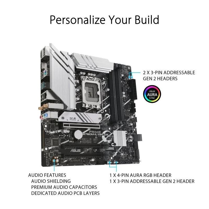 La placa base ASUS PRIME B760M-A WIFI D4 diseñada para procesadores híbridos Intel Core de 12ª y 13ª generación es ideal para montar un sistema potente y versátil. Las placas base ASUS Prime están diseñadas y fabricadas para usuarios exigentes que buscan un rendimiento constante y fiabilidad a largo plazo.