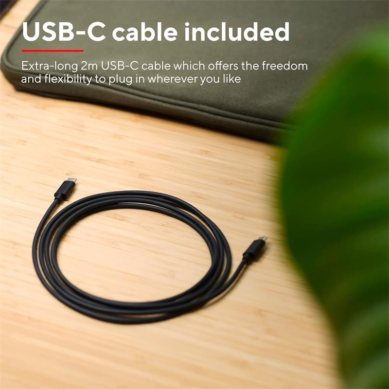 - Contigo a todas partes Maxo está provisto de un cable USB-C de 2 metros de largo que te brinda toda la libertad y flexibilidad que necesitas para trabajar desde el escritorio, el sofá o la cama.