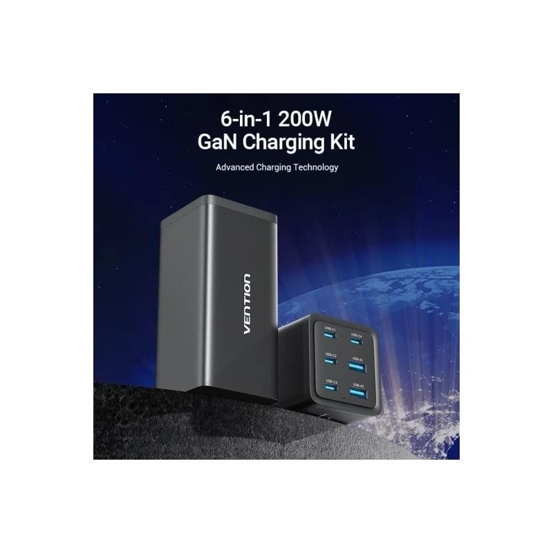 CARGADOR DE ESCRITORIO VENTION GAN 4XUSB-C 2XUSB-A 200W