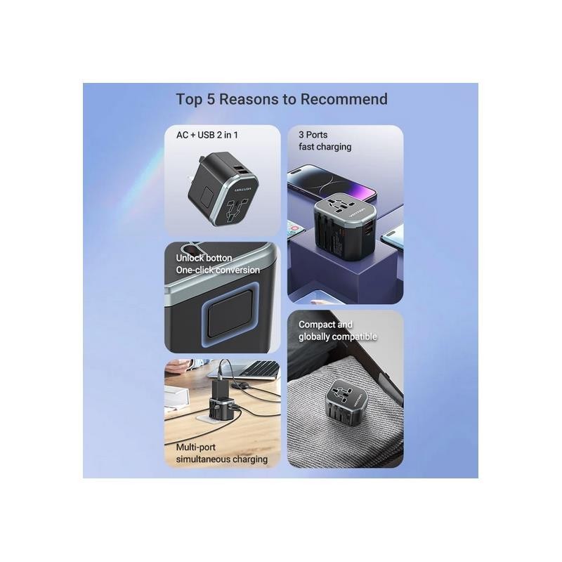 Adaptador de viaje universal con salida AC de 1840W y carga rápida, capaz de alimentar hasta 4 dispositivos al mismo tiempo.