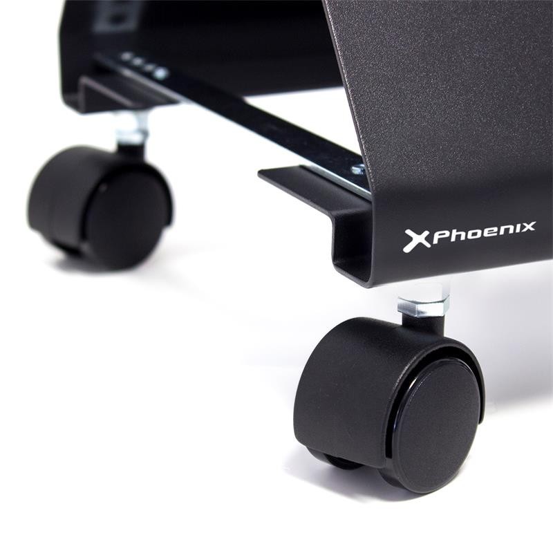 Perfecto soporte resistente Phoenix para ordenadores con ruedas de color negro.