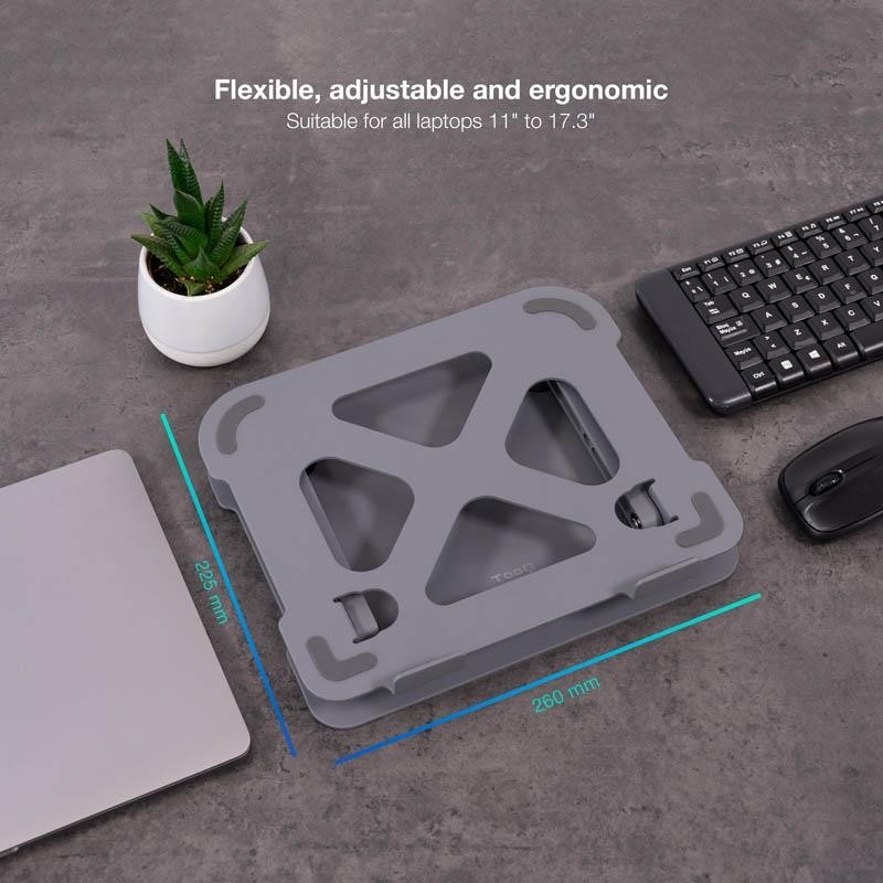 Descubre la mejor forma de elevar un portátil o una tablet. Nuestro soporte TooQ TQLRS0012-AL-G está diseñado para adoptar la mejor posición para mantener una higiene postural óptima, ponte cómodo y trabaja sin tensión. Además, es ligero y plegable lo que te permitirá llevarlo siempre contigo y usarlo en cualquier ocasión.