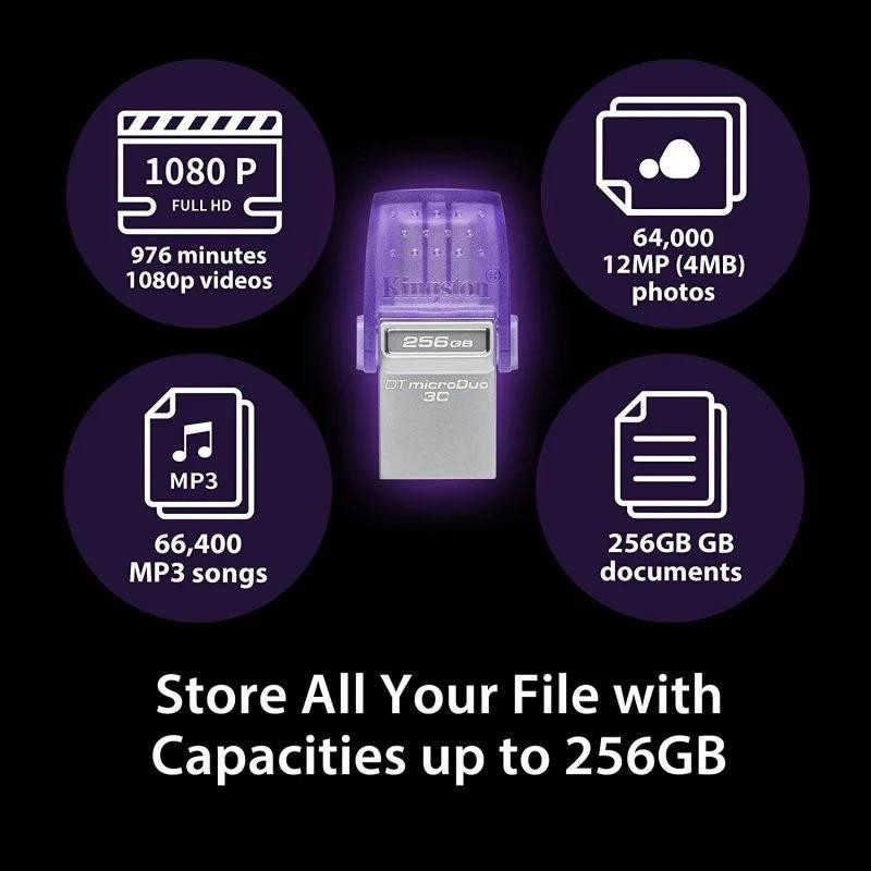 DataTraveler® microDuo? 3C tiene una doble interfaz que funciona con los nuevos USB Type-C® y los puertos USB Type-A tradicionales. Es una forma ideal de liberar espacio en tu smartphone o tableta con hasta 256 GB de almacenamiento adicional para fotos y vídeos. El atractivo formato ofrece una cómoda conectividad plug and play. Transfiere rápidamente archivos entre tus dispositivos a una velocidad de hasta 200 MB/s de lectura por el USB 3.2 Gen 1