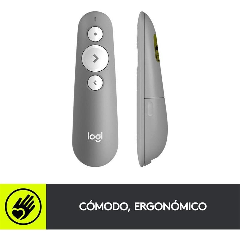 - Navegación por diapositivas intuitiva: Los tres botones del distintivo diseño del R500 facilitan la navegación por la presentación sin necesidad de fijar la vista en el mando.