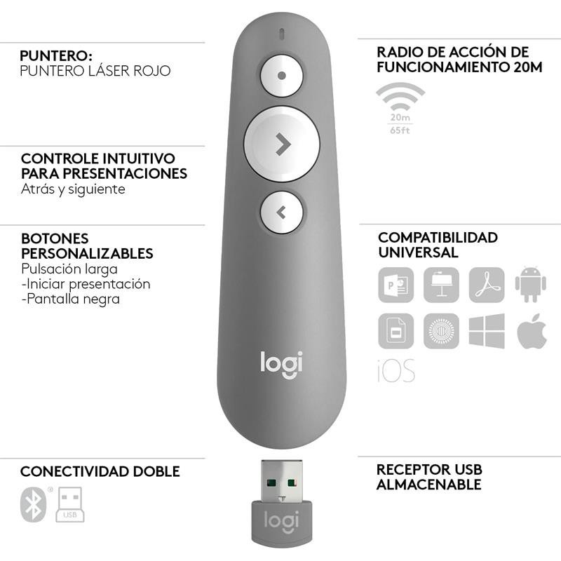 - Aplicación Logitech Presentation: Personalice las funciones de botones, controle la duración de las pilas y configure un temporizador en pantalla desde la aplicación Logitech Presentation. No tema que el ordenador entre en estado de suspensión, la aplicación lo mantiene activo mientras realiza la presentación. *Sólo disponible al instalar software en Mac y PC. Requiere la instalación del software Logitech Presentation (sólo compatible con Windows 7 o posteriores / macOS X 10.12 o posteriores).