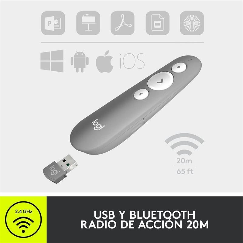 - Radio de acción de 20 metros Conecte el R500 al ordenador mediante el receptor USB o tecnología Bluetooth® de bajo consumo. Luego muévase y presente con plena libertad a una distancia de hasta 20 metros. *Depende de las condiciones del entorno y de los dispositivos.
