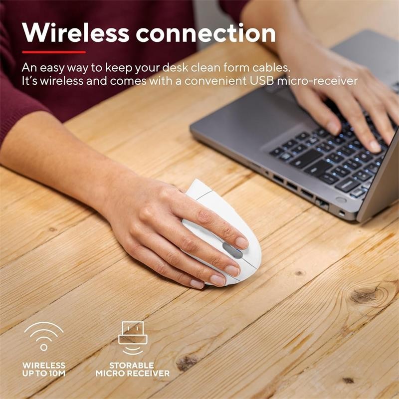 - Totalmente natural: La forma ergonómica del ratón inalámbrico Verto coloca el brazo y la muñeca en una posición natural de 60 grados, por lo que se reduce la tensión del brazo y la muñeca . Esto significa que podrá trabajar con mayor comodidad y aumentar la productividad.