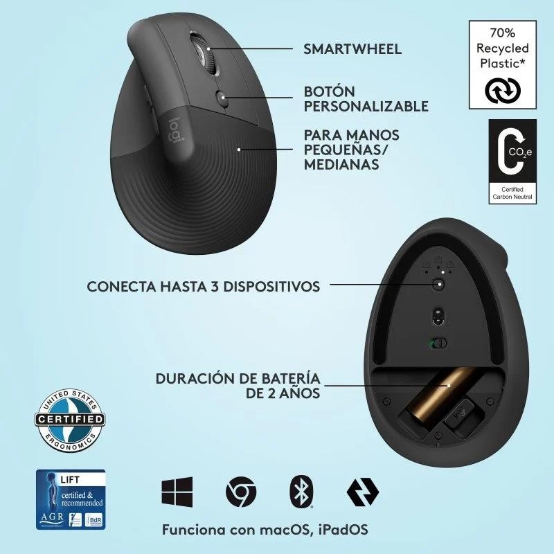 - Vente arriba con Lift: Anima tu escritorio con el Ratón Ergonómico Vertical Lift de Logitech. Adecuado para manos pequeñas y medianas.