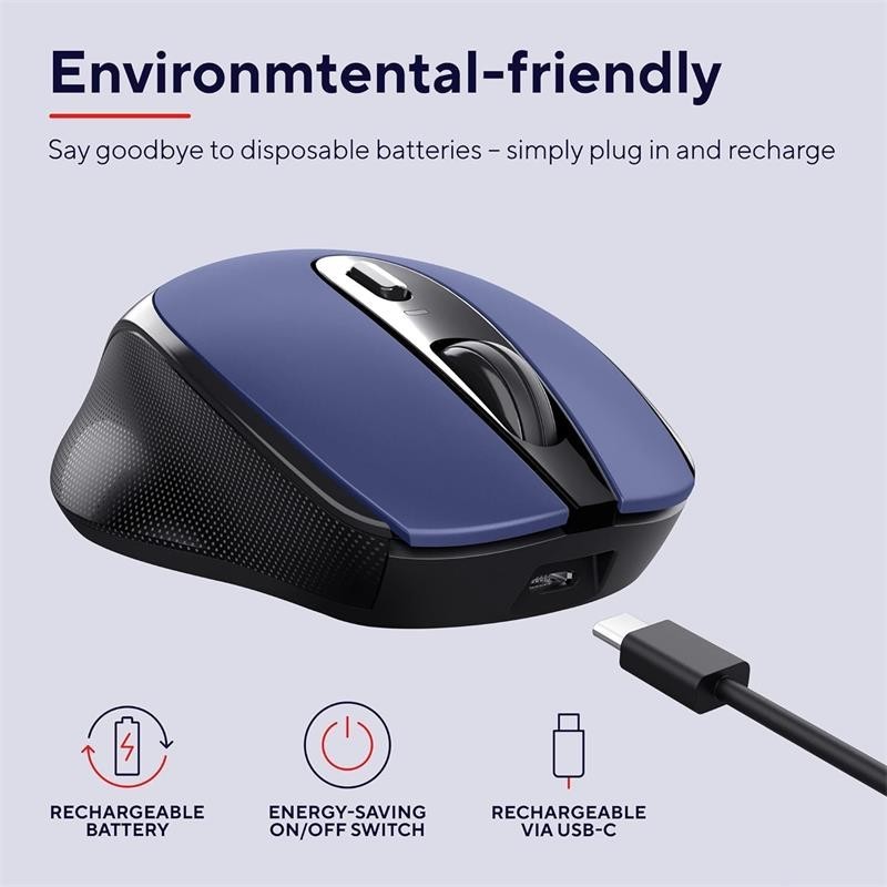 El ratón inalámbrico Zaya tiene una batería recargable incorporada, lo que significa que puede olvidarse completamente de comprar más baterías. Utilice el cable USB-C incluido para cargarlo. No solo permite ahorrar dinero, sino que también es respetuoso con el medio ambiente.
