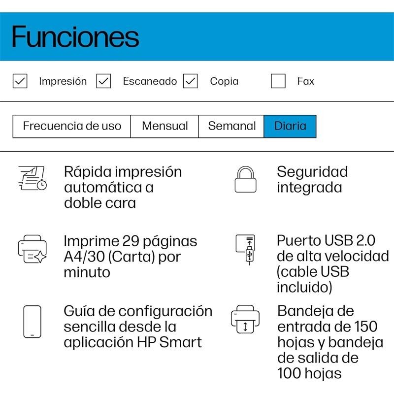 - Integración con HP App: Configuración y gestión de tareas de impresión, copia y escaneo de forma sencilla.