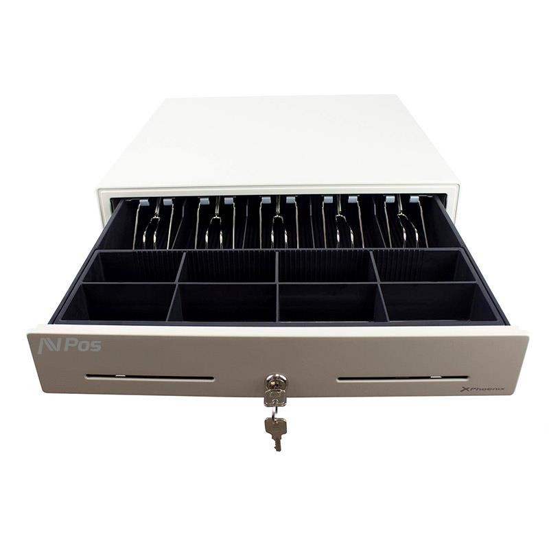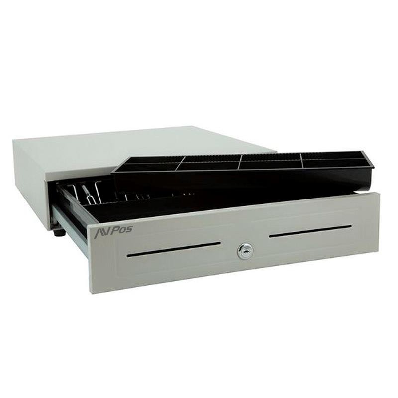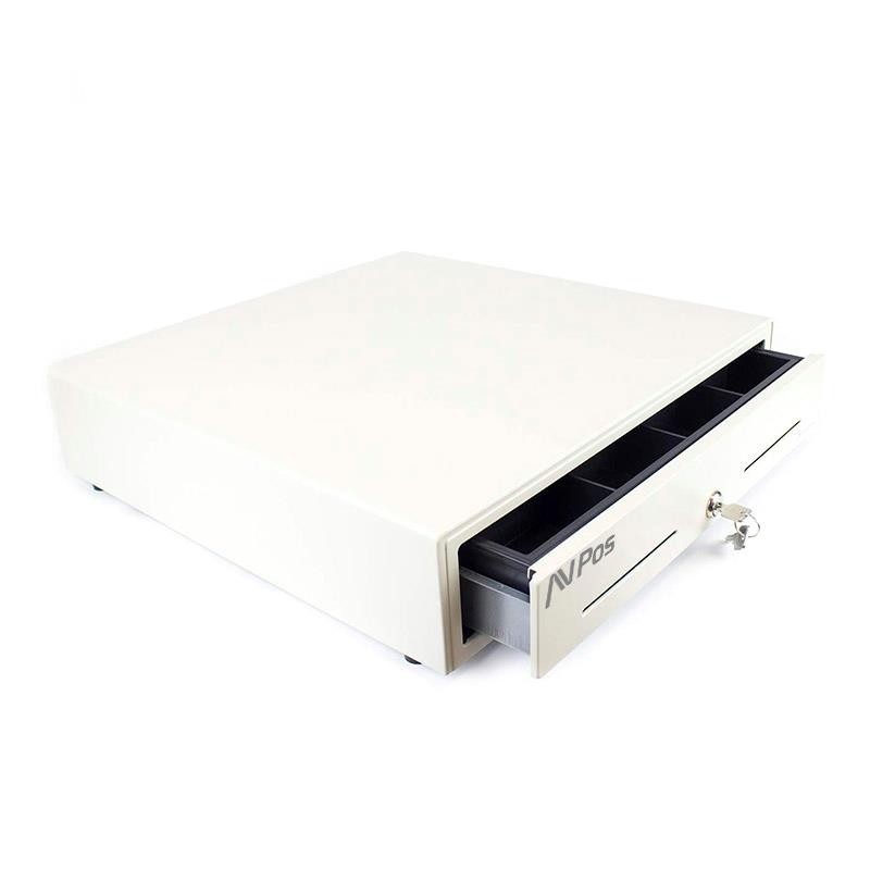 CAJÓN PORTAMONEDAS AVPOS 41CM WHITE - Cajón portamonedas automático con 8 departamentos para monedas, 4 para billetes, y 2 ranuras frontales. Fabricado en acero laminado en frío, con conexión RJ11 y recubrimiento anti polvo. Disponible en color negro o blanco. Peso: 7,15 Kg.