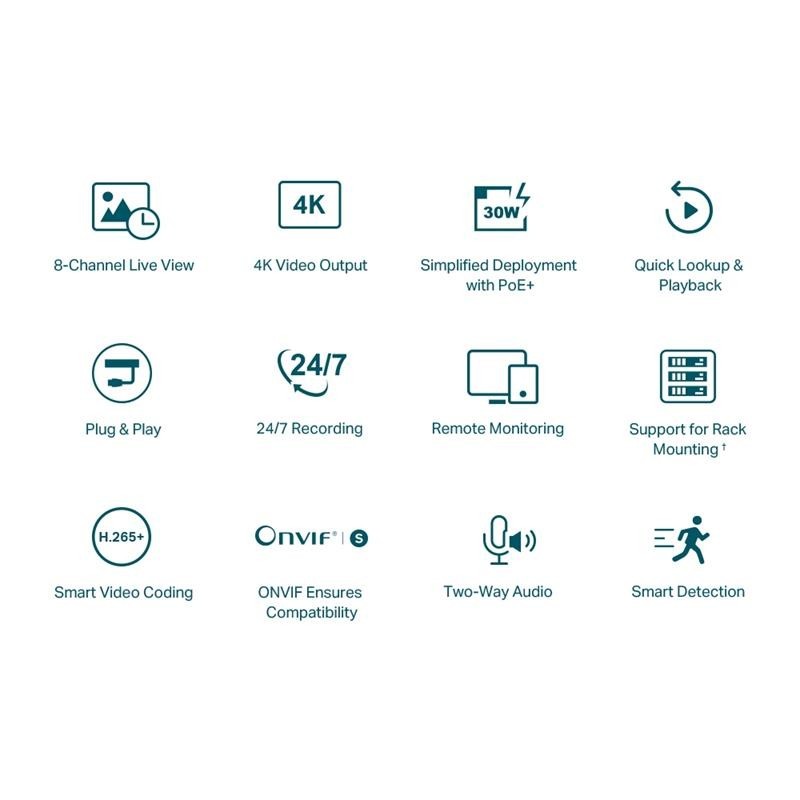 - Salida de Video HDMI 4K y Capacidad de Decodificación de 16MP. La definición de imagen de hasta 8MP y una pantalla de 8 canales garantizan capturar cada detalle, desde todos los ángulos 2 .